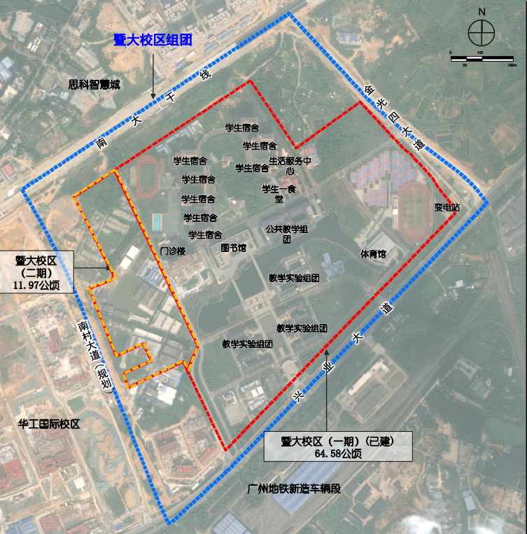 暨南大學(xué)番禺校區(qū)位于廣州市番禺區(qū)興業(yè)大道東855號(hào)。校區(qū)一、二期總用地面積76.55公頃,其中:第一期用地64.58公頃,現(xiàn)狀總建筑面積37.91萬(wàn)平方米(計(jì)容面積31.33萬(wàn)平方米);第二期用地11.97公頃,現(xiàn)狀以廠房為主,目前已完成土地征收(地塊范圍如圖1所示)。