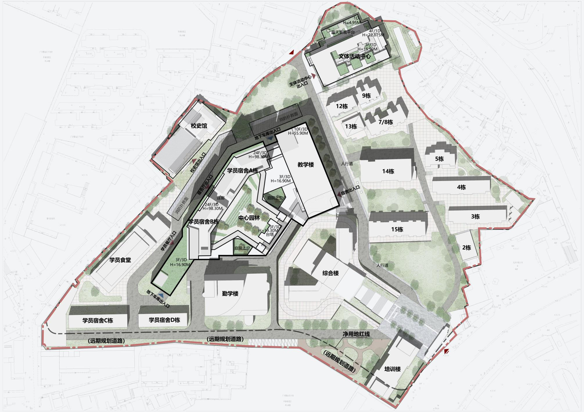 項(xiàng)目可建設(shè)用地面積約50877.86㎡(含教學(xué)區(qū)及家屬區(qū)),建成后教學(xué)區(qū)總建筑面積129735.48㎡,其中:保留建筑面積38672.48 ㎡(涉及改造建筑面積5099.88 ㎡),新建建筑面積91063 ㎡(其中:地上建筑面積64963 ㎡,地下建筑面積26100㎡)。建設(shè)內(nèi)容主要包括拆除部分低矮老舊建筑,將原羽毛球館改造為校史館,現(xiàn)有學(xué)員食堂廚房提升改造,培訓(xùn)樓改造,綜合樓(原教學(xué)樓)入口雨棚及車行坡道改造,新建教學(xué)宿舍綜合體、學(xué)員文體活動(dòng)中心、地下室以及室外配套工程等。