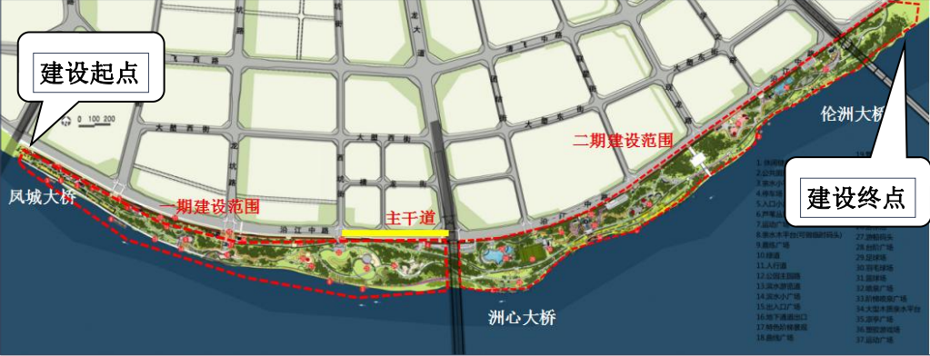 本項(xiàng)目建設(shè)用地總面積為497615㎡,主要建設(shè)內(nèi)容包括:土方工程、園路與地面硬化工程、植被小品工程、綠化工程、配套用房建筑工程、室外體育活動(dòng)場(chǎng)地工程以及配套設(shè)施工程等,分兩期建設(shè)。一期由鳳城大橋至洲心大橋,二期由洲心大橋至倫洲大橋。配套市政道路主線路全長(zhǎng)約520m,道路紅線寬33.5m,建設(shè)內(nèi)容包括道路工程、交通工程、排水工程、照明工程、綠化工程及其他零星工程,于一期工程中實(shí)施。