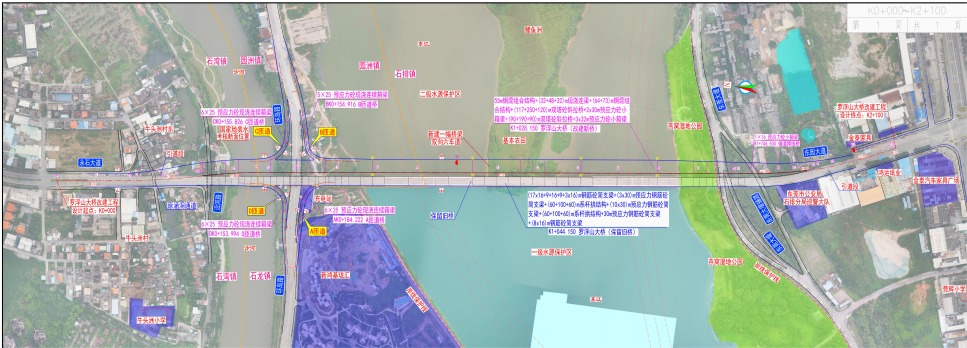 羅浮山大橋改建工程推薦采用保留改建方案,路線起點 K0+000 接順惠州市博羅縣石灣鎮(zhèn)橋北側(cè)永石大道的舊路中線位置處,之后向東側(cè)偏出,平行于舊橋呈南北分布依次跨過沙河及東江,在東莞側(cè)設(shè)計線逐漸靠近舊路中線,并與原引道段接順拼寬落地,之后路線終點位置 K2+100 接順東莞側(cè)東園大道,另外在橋梁北側(cè)設(shè)置四條上下橋匝道 A、B、C、D,位于東江與沙河之間接既有雙向四車道環(huán)島路。項目主線全長約 2.1km。