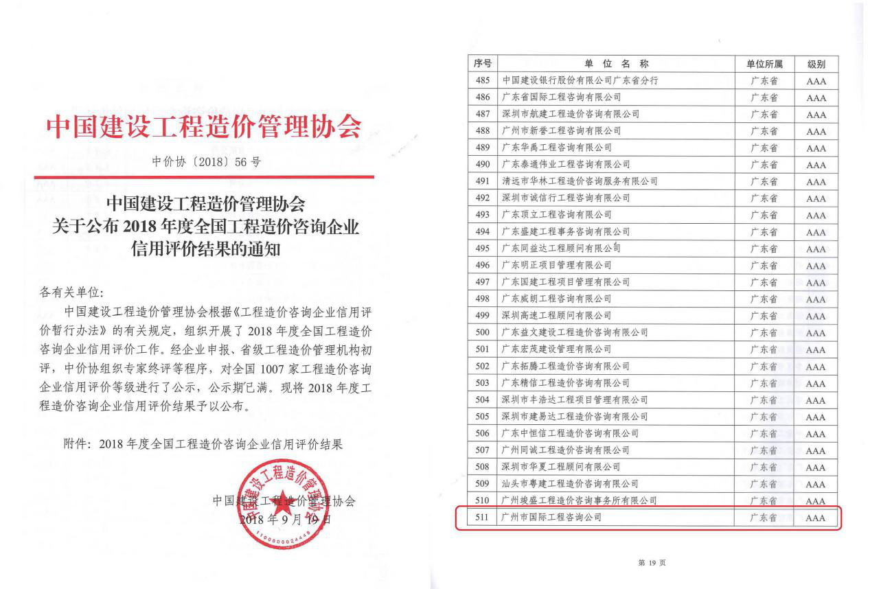 根據(jù)《工程企業(yè)信用評價暫行辦法》、《中國建設(shè)工程造價管理協(xié)會關(guān)于開展2018年工程造價咨詢企業(yè)信用評價工作的通知》(中價協(xié)〔2018〕2號)、《廣東省工程造價協(xié)會關(guān)于開展2018年工程造價咨詢企業(yè)信用評價工作的通知》(粵價協(xié)〔2018〕1號)等文件要求,我司在今年3月開啟了2018年工程造價咨詢企業(yè)信用評價的申報工作。在公司多個部門一個多月的通力協(xié)作下,繼獲得廣東省造價管理協(xié)會優(yōu)秀的初評成績后,經(jīng)過中國建設(shè)工程造價管理協(xié)會的審查評定,我司最終獲得了工程造價咨詢企業(yè)信用評價AAA級(最高等級),這是自2015年中國建設(shè)工程造價管理協(xié)會首次開展工程造價咨詢企業(yè)信用評價工作以來,我司連續(xù)兩次獲評工程造價咨詢企業(yè)信用評價AAA級。