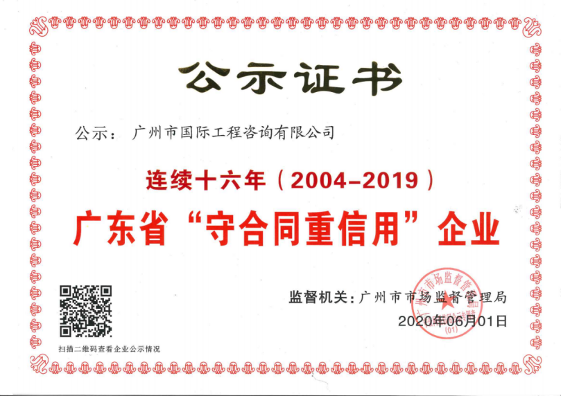近日,廣州市國(guó)際工程咨詢有限公司順利通過(guò)廣東省市場(chǎng)監(jiān)督管理局與廣州市市場(chǎng)監(jiān)督管理局評(píng)審,榮獲“廣東省守合同重信用企業(yè)”稱號(hào),這是自2004年以來(lái),我司連續(xù)16年獲頒此殊榮,這也是我司多年守法經(jīng)營(yíng),深入推動(dòng)誠(chéng)信建設(shè)、堅(jiān)持誠(chéng)信履約所取得的重要成果。