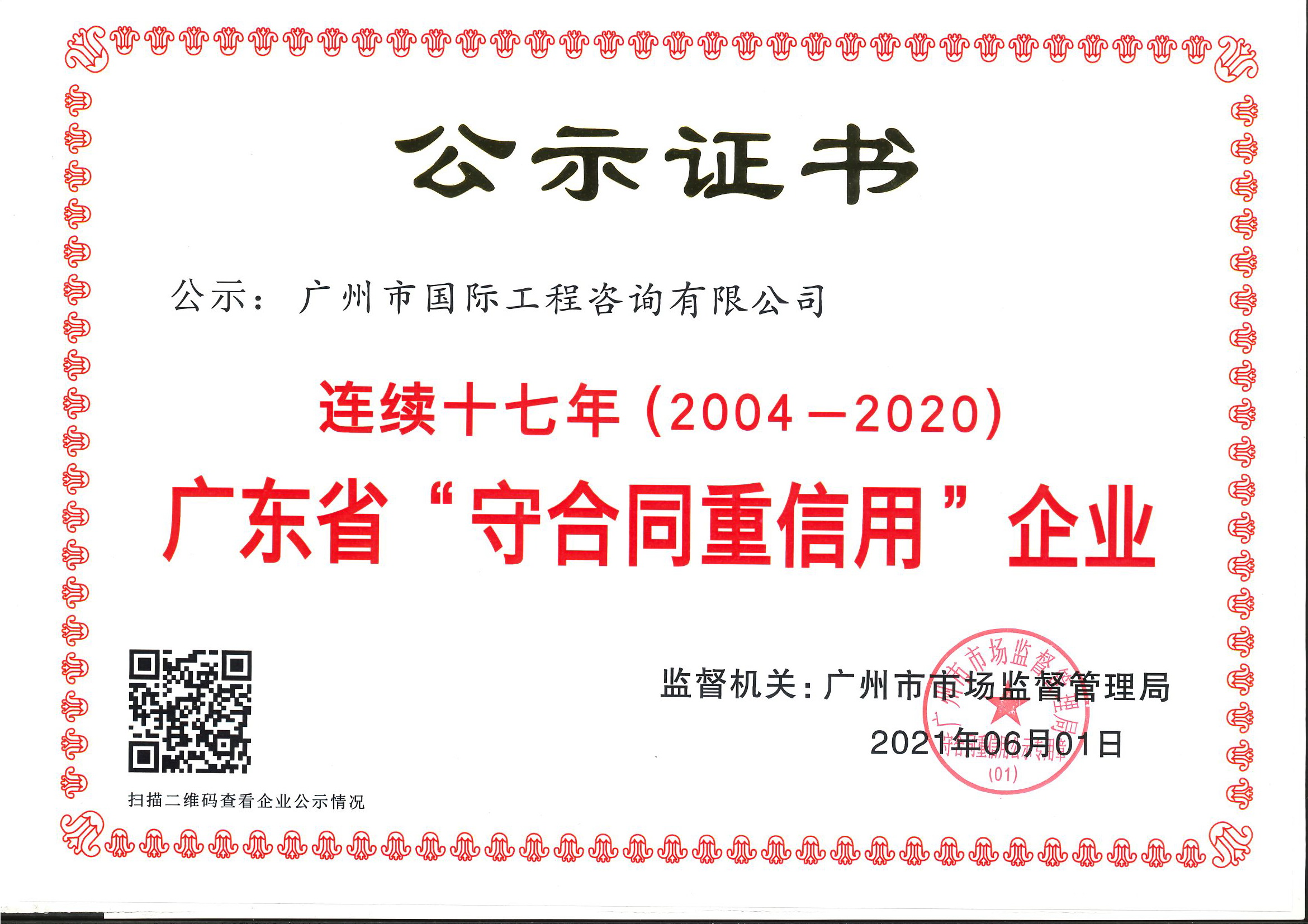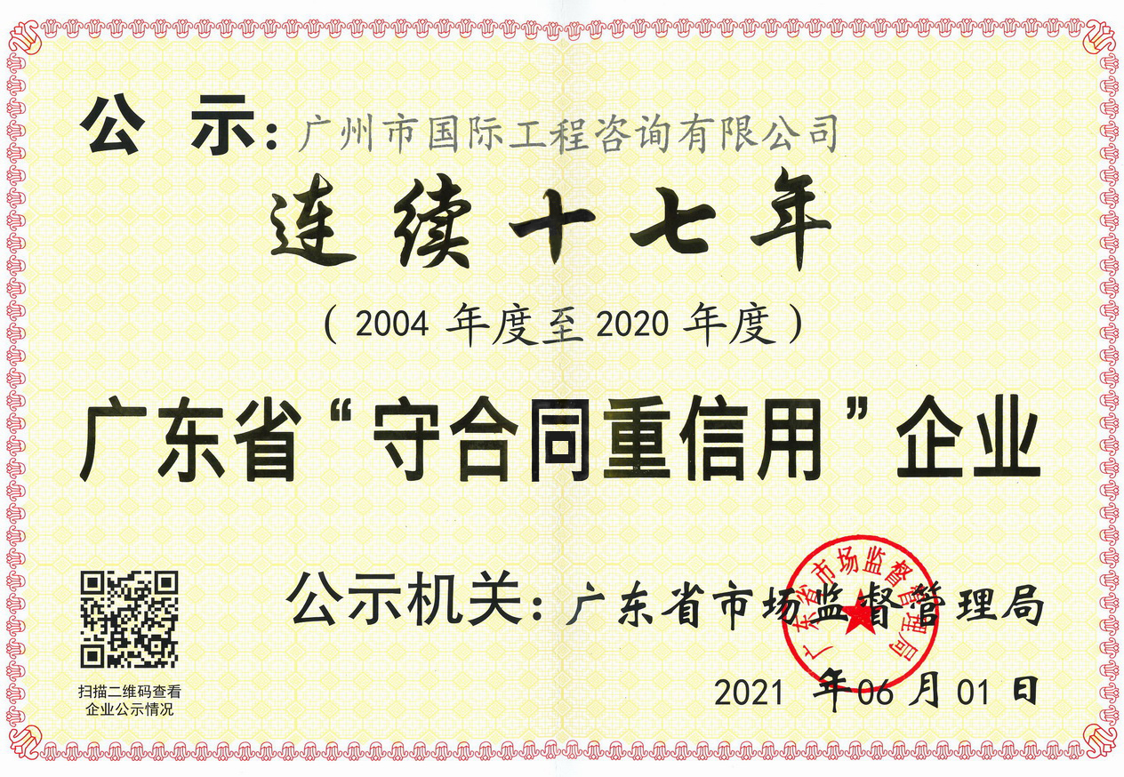 近日,廣州市國際工程咨詢有限公司順利通過廣東省市場監(jiān)督管理局與廣州市市場監(jiān)督管理局評審,榮獲“廣東省守合同重信用企業(yè)”稱號,這是自2004年以來,我司連續(xù)十七年獲頒此殊榮,這也是我司多年守法經營,深入推動誠信建設、堅持誠信履約所取得的重要成果。